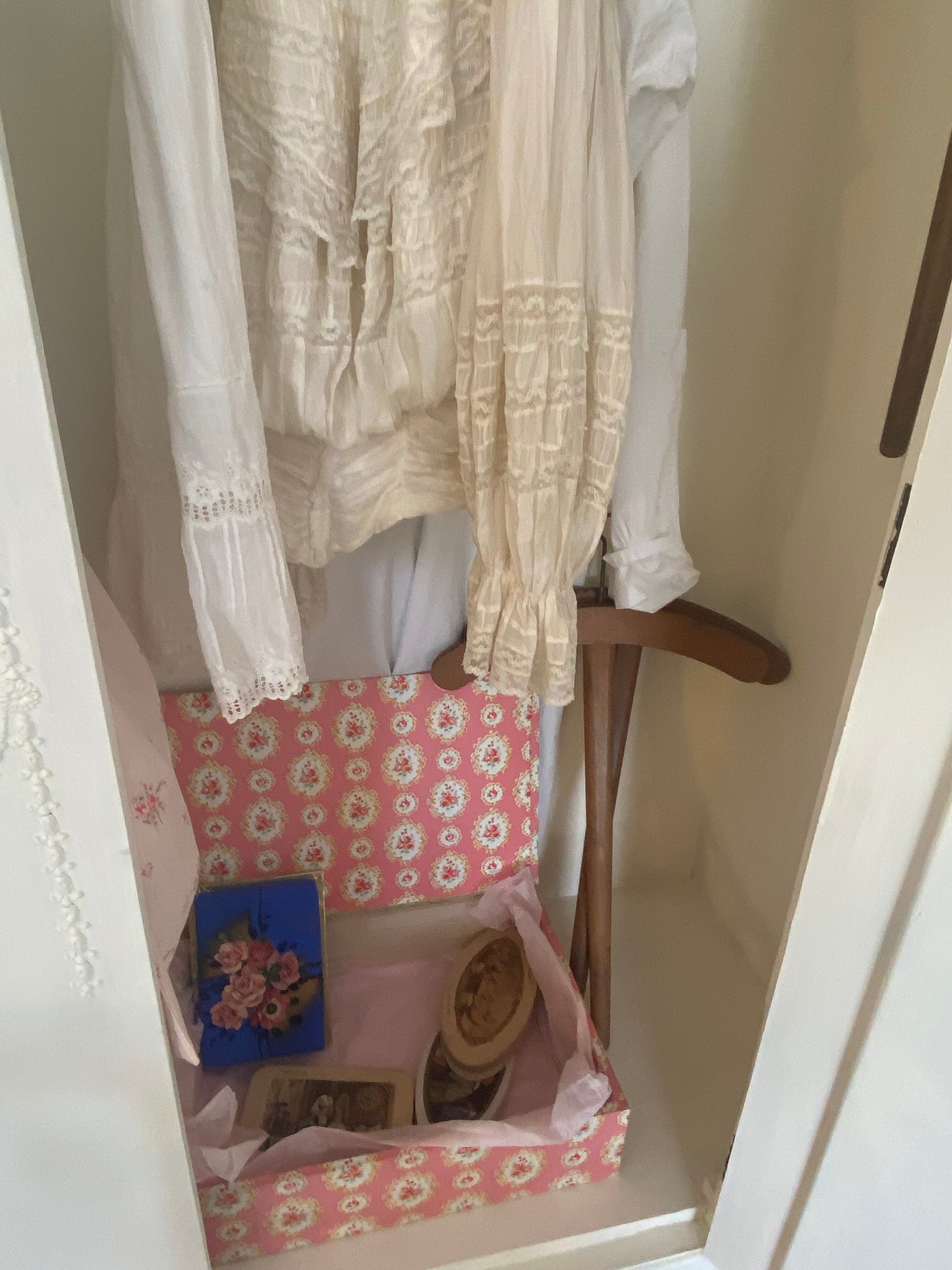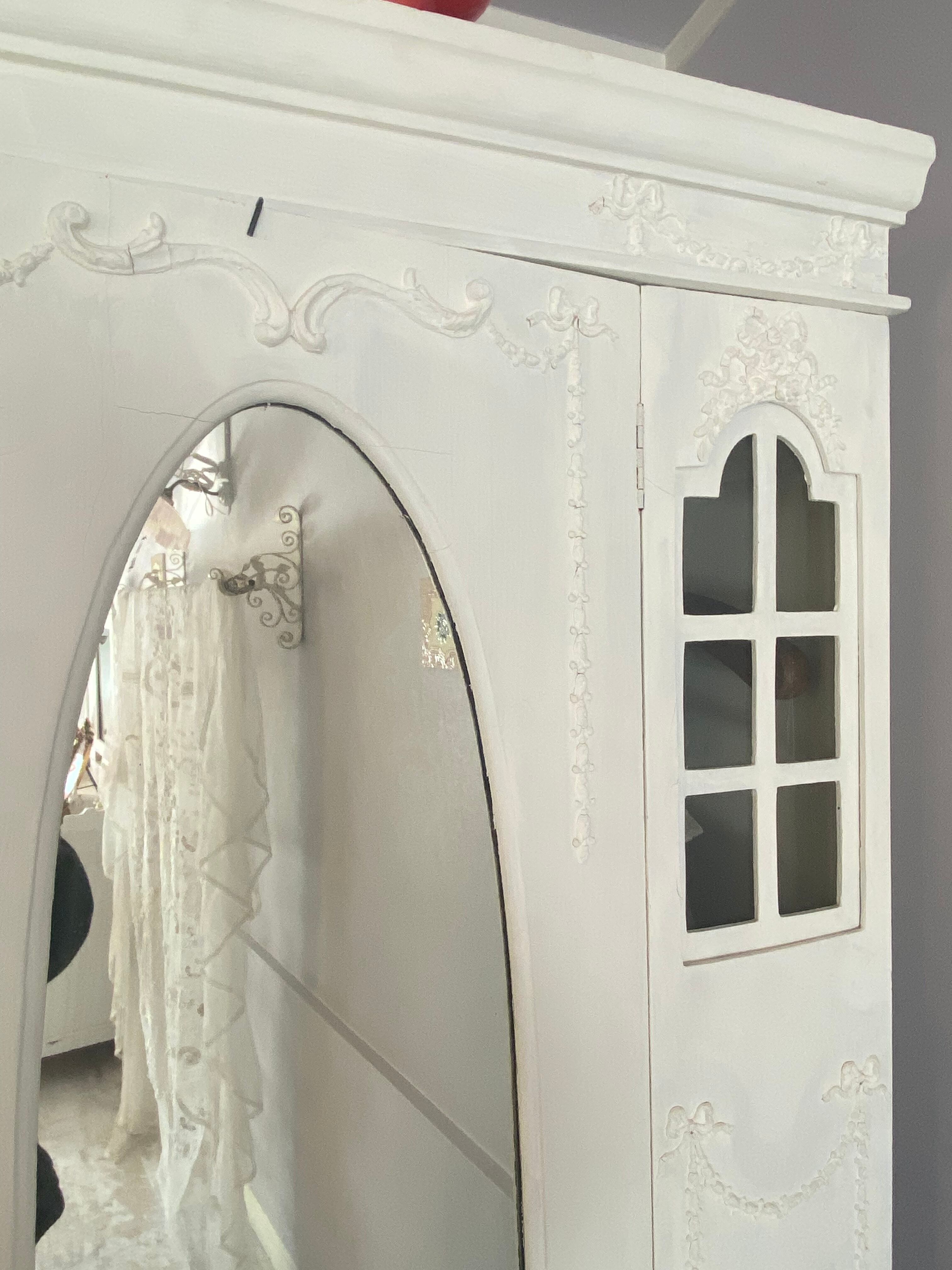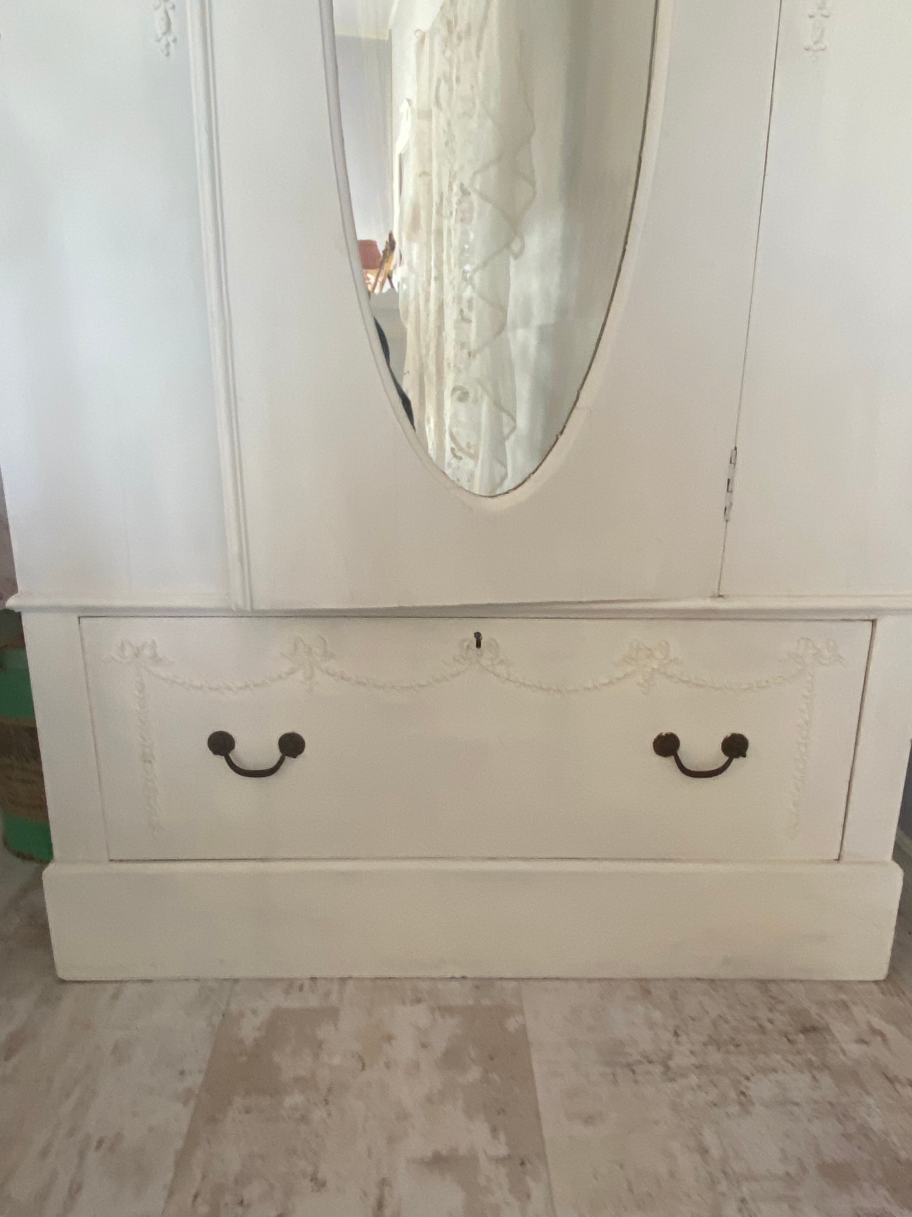 とてもロマンチックなワードローブ(洋服かけ)です。リボンとガーランドのモチーフがあらゆる部分にたくさん施されていてとても愛らしいです。どんなマドモアゼルが使っていたのでしょうか?扉にはミラーが付いています。(状態美品)コーデ写真の撮影も映えますね♪