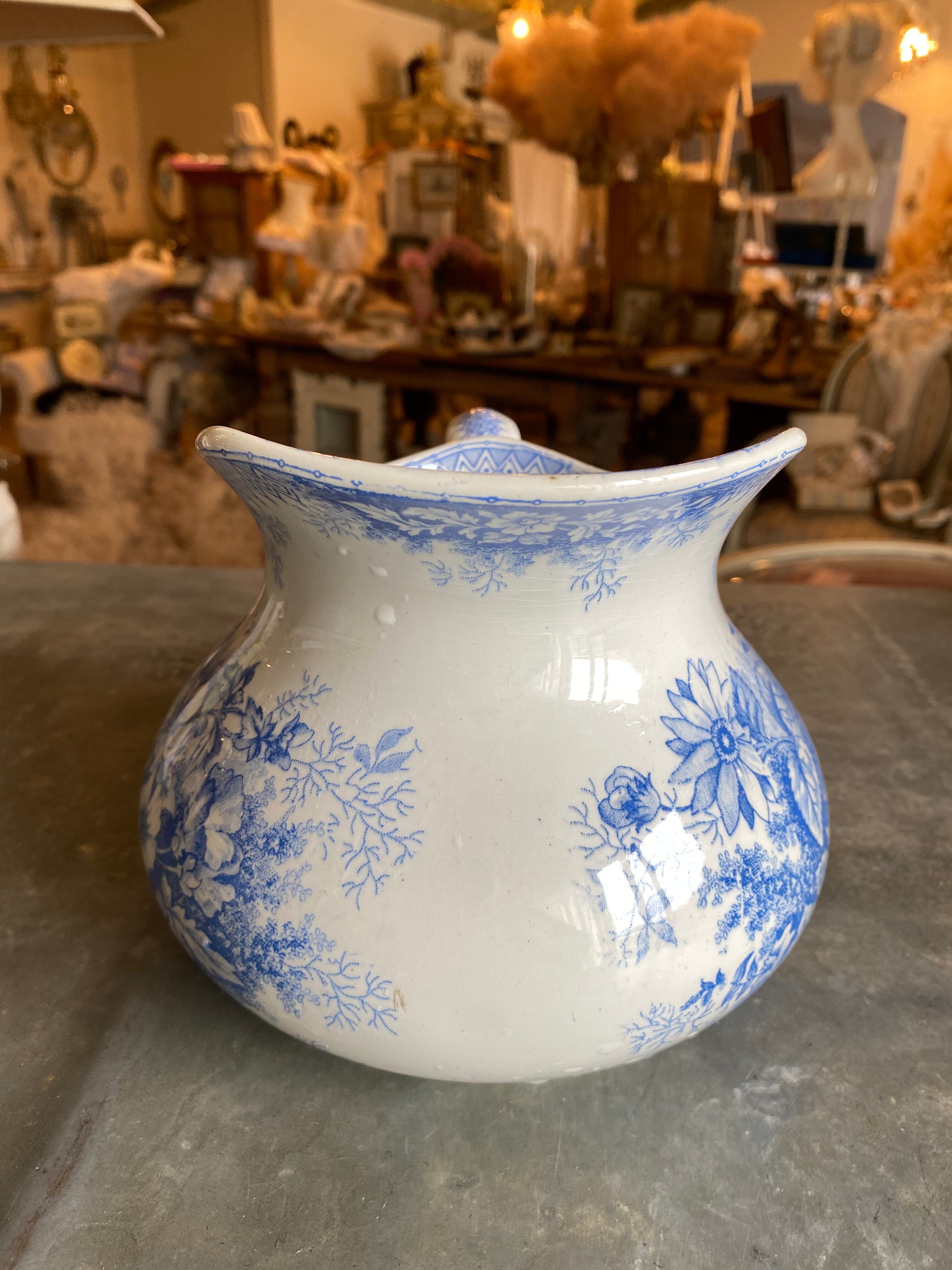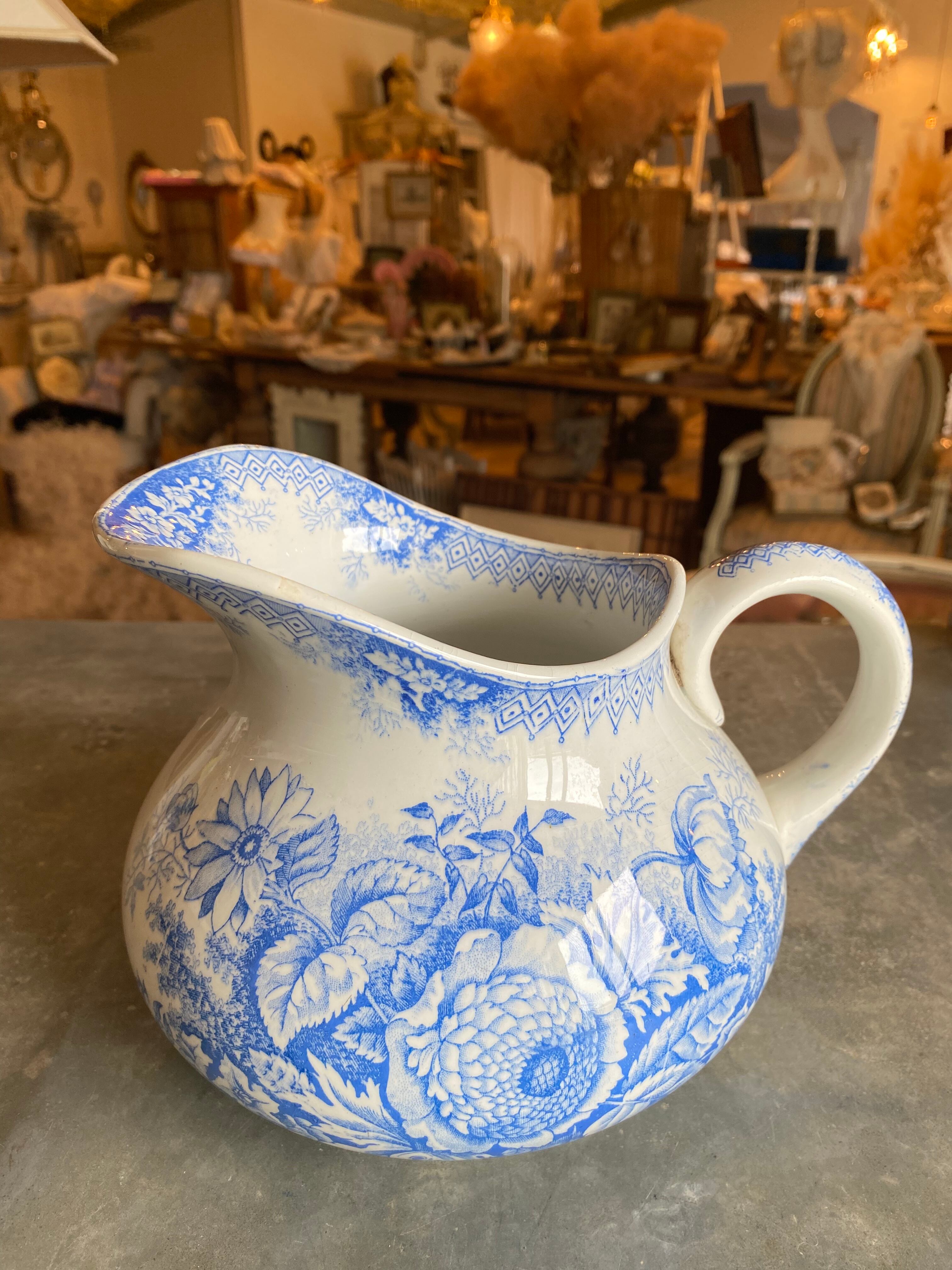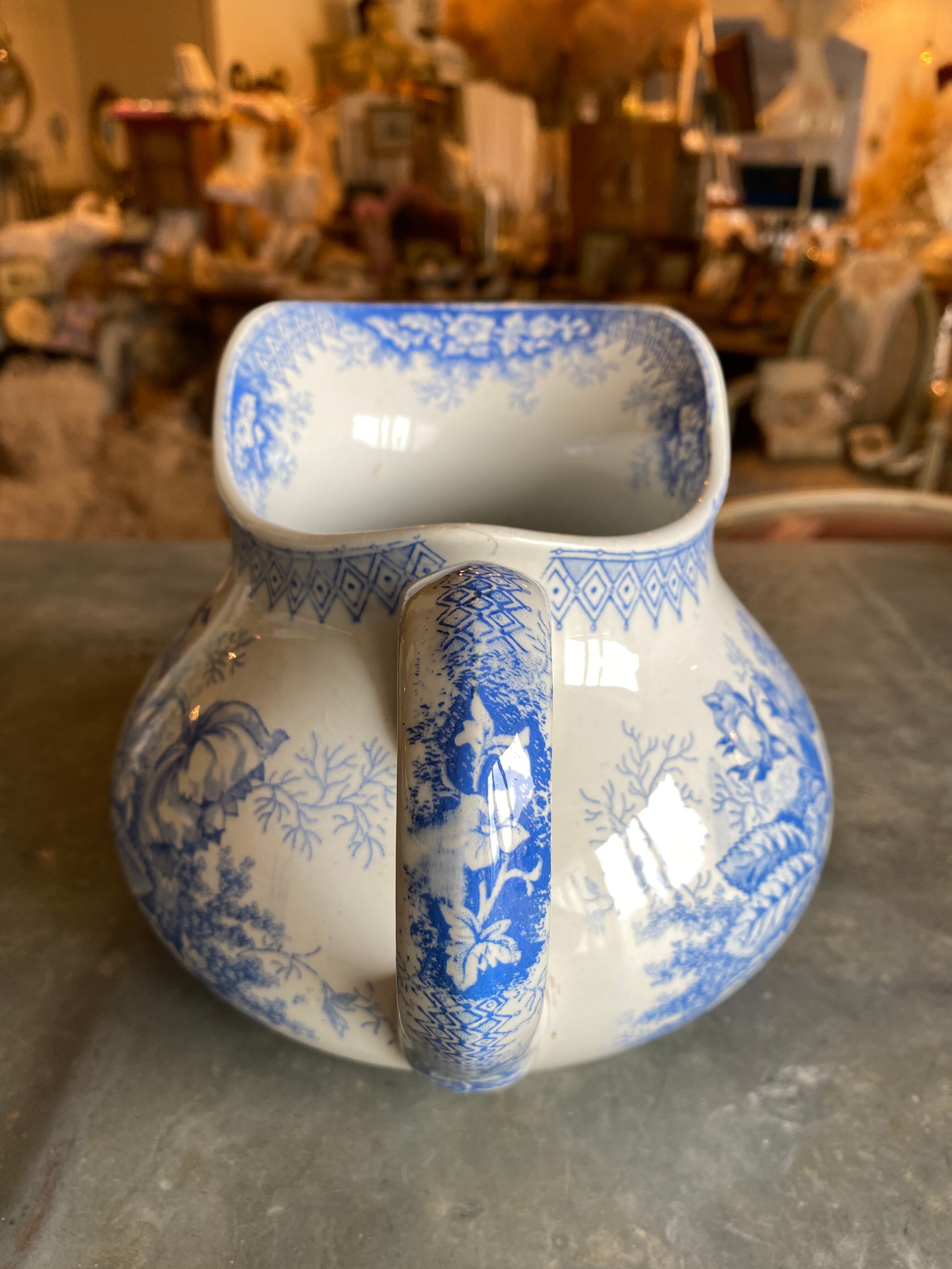 サンタマン ジャルディニエールシリーズのピッチャーとボウルのセットです。今回は爽やかなサックスブルーのご紹介です。ボウルは縁裏に一箇所欠けがございますが、目立つものではございません。多少貫入もありますが、特筆すべきダメージはありません。同様にピッチャーは更に状態が良い美品となります。