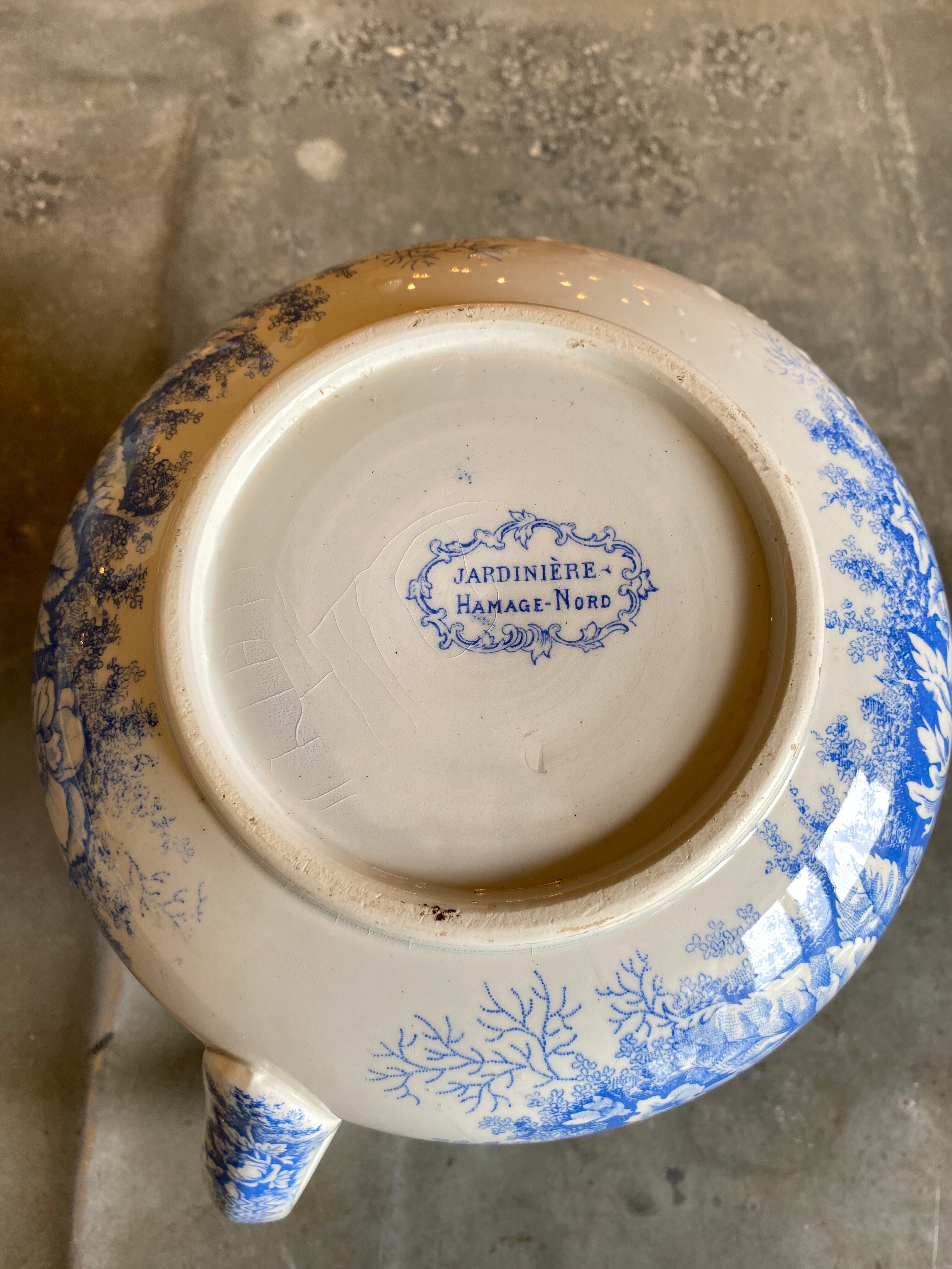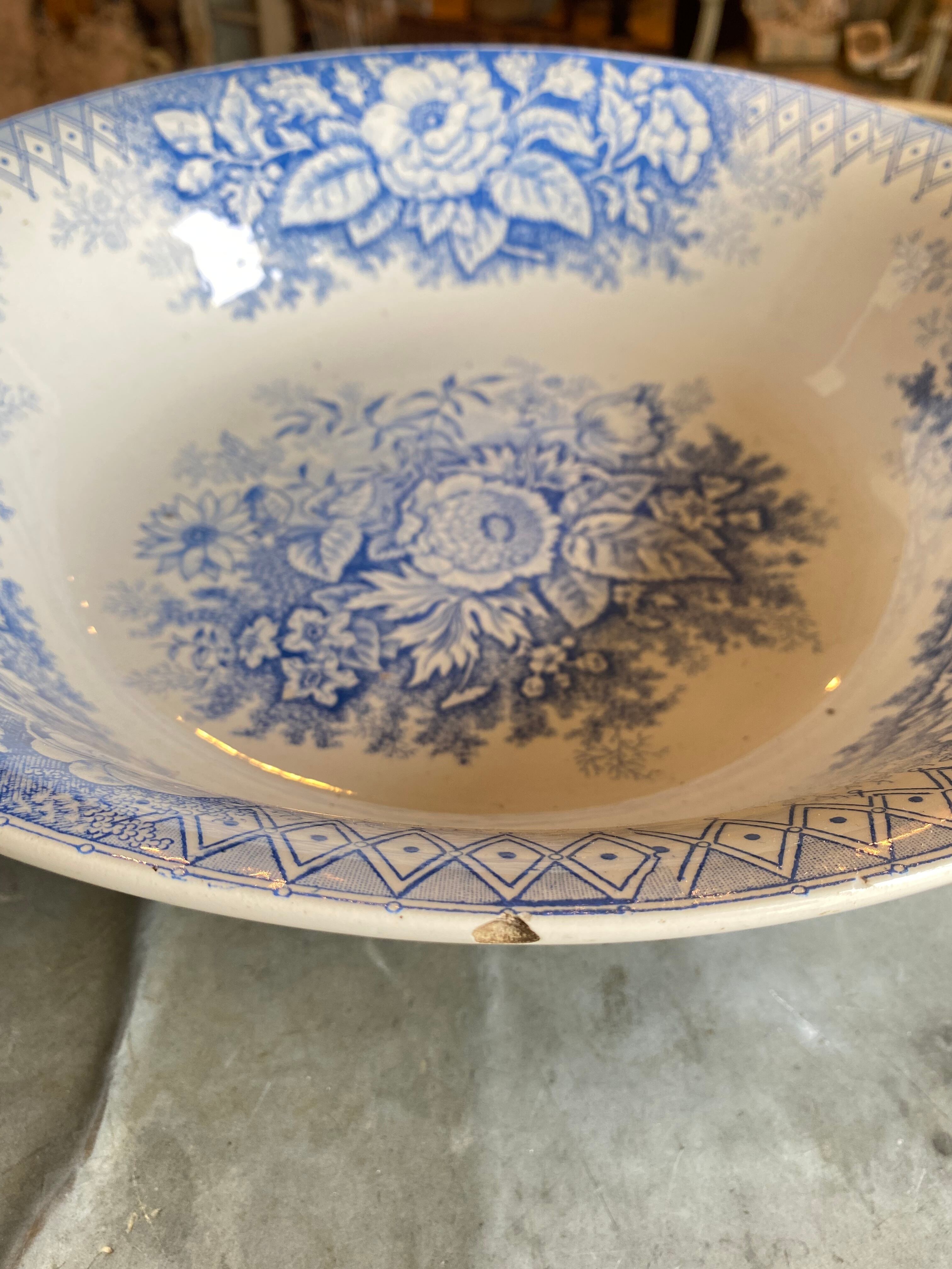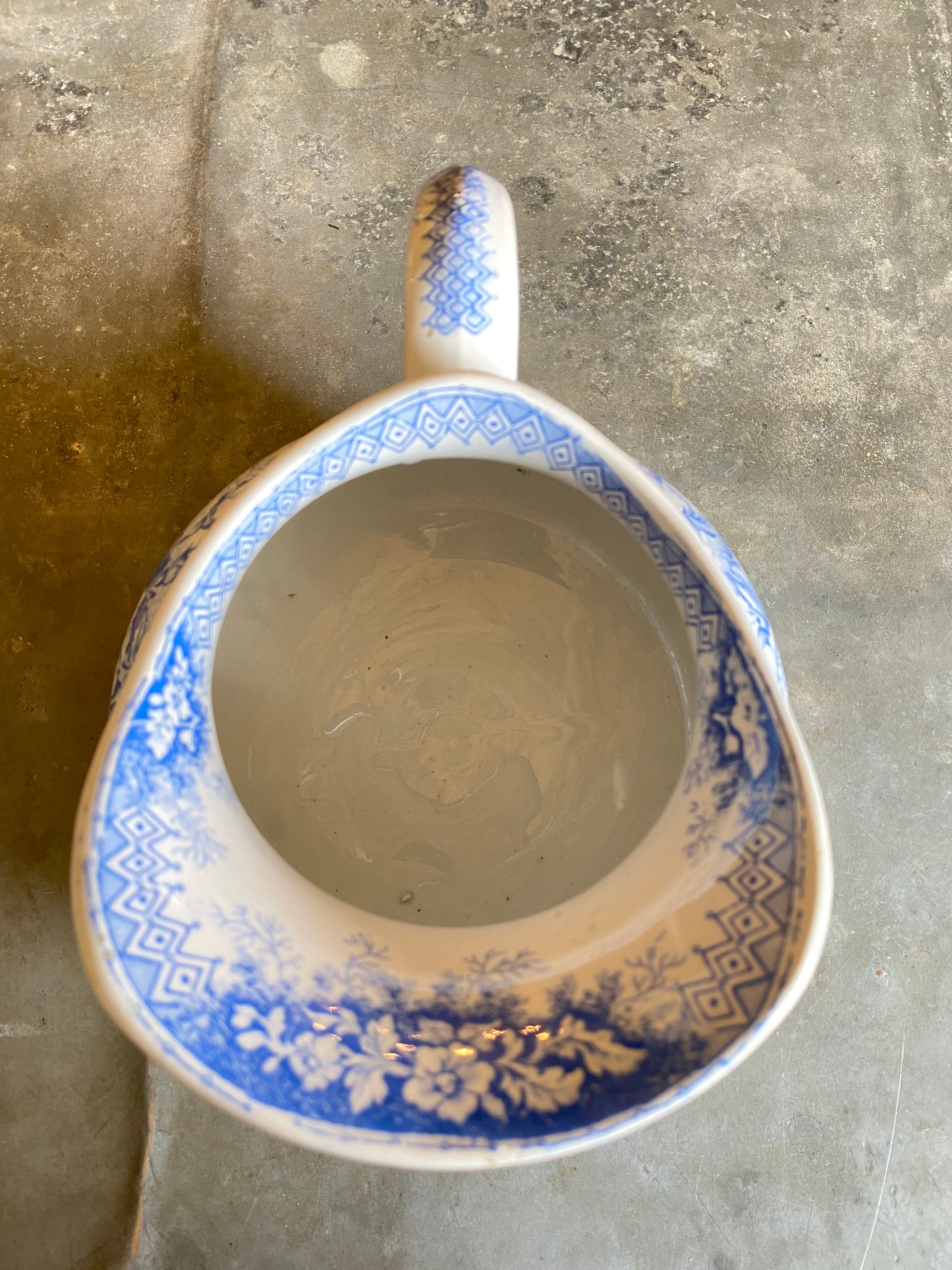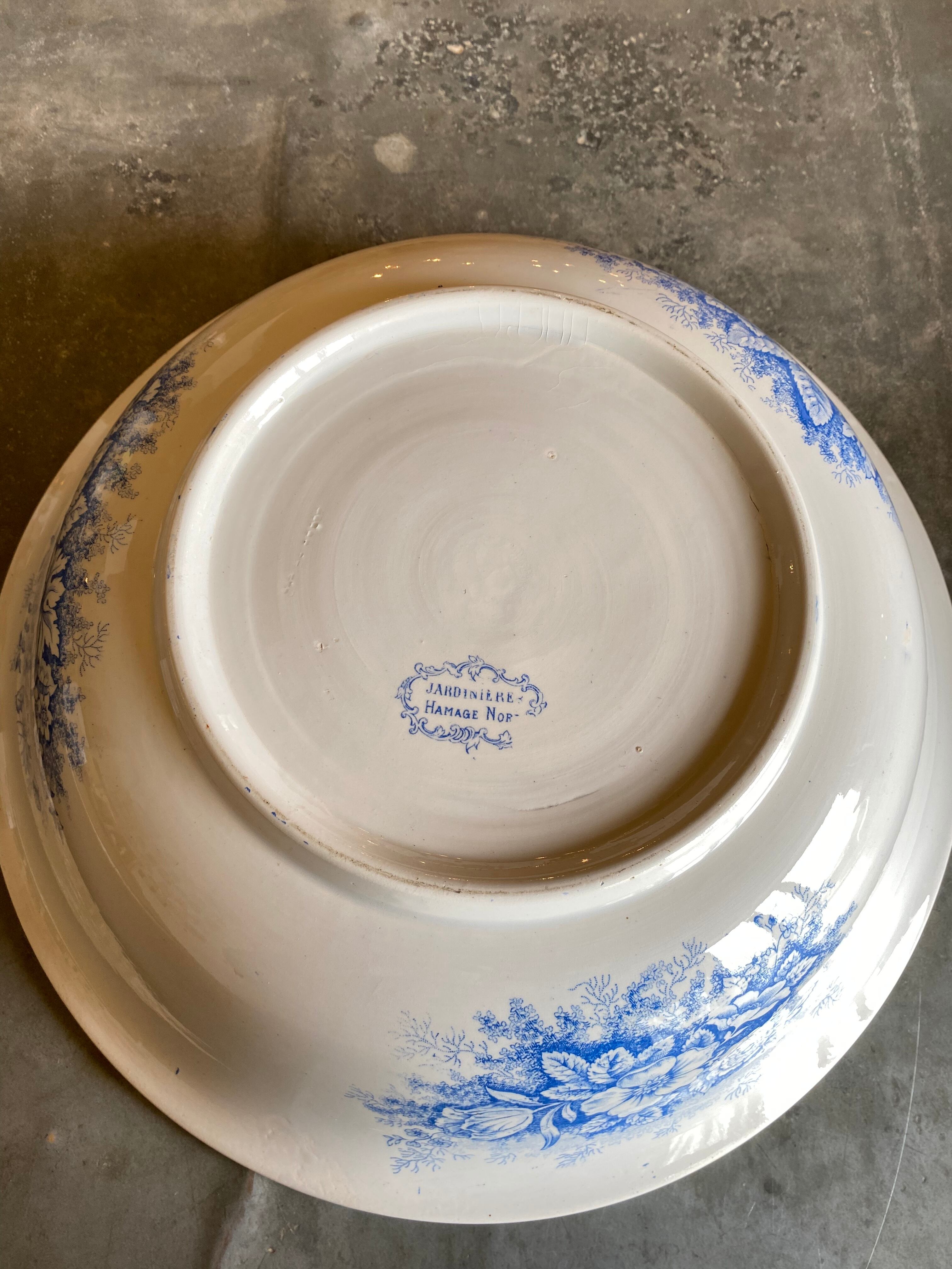 サンタマン ジャルディニエールシリーズのピッチャーとボウルのセットです。今回は爽やかなサックスブルーのご紹介です。ボウルは縁裏に一箇所欠けがございますが、目立つものではございません。多少貫入もありますが、特筆すべきダメージはありません。同様にピッチャーは更に状態が良い美品となります。