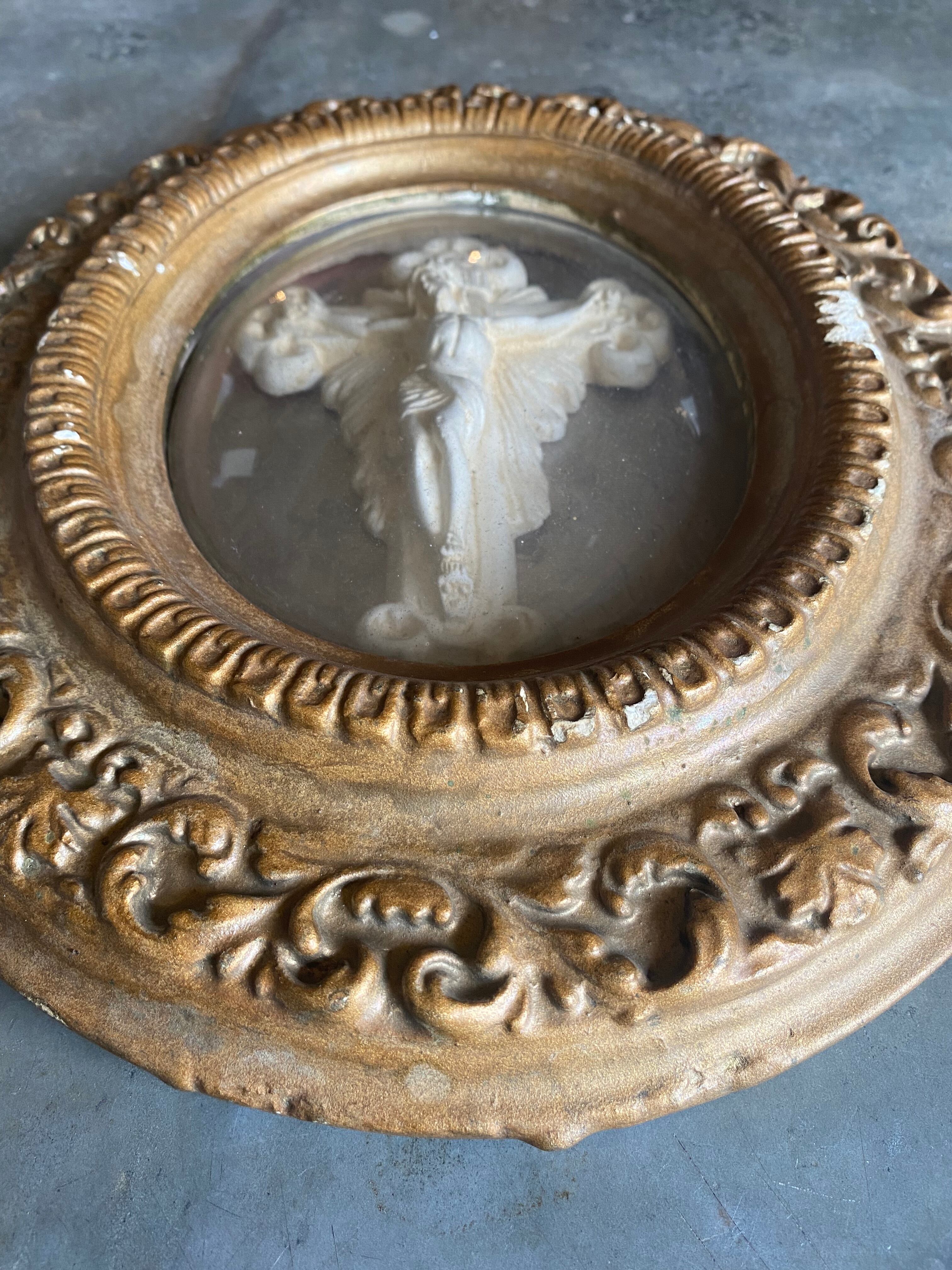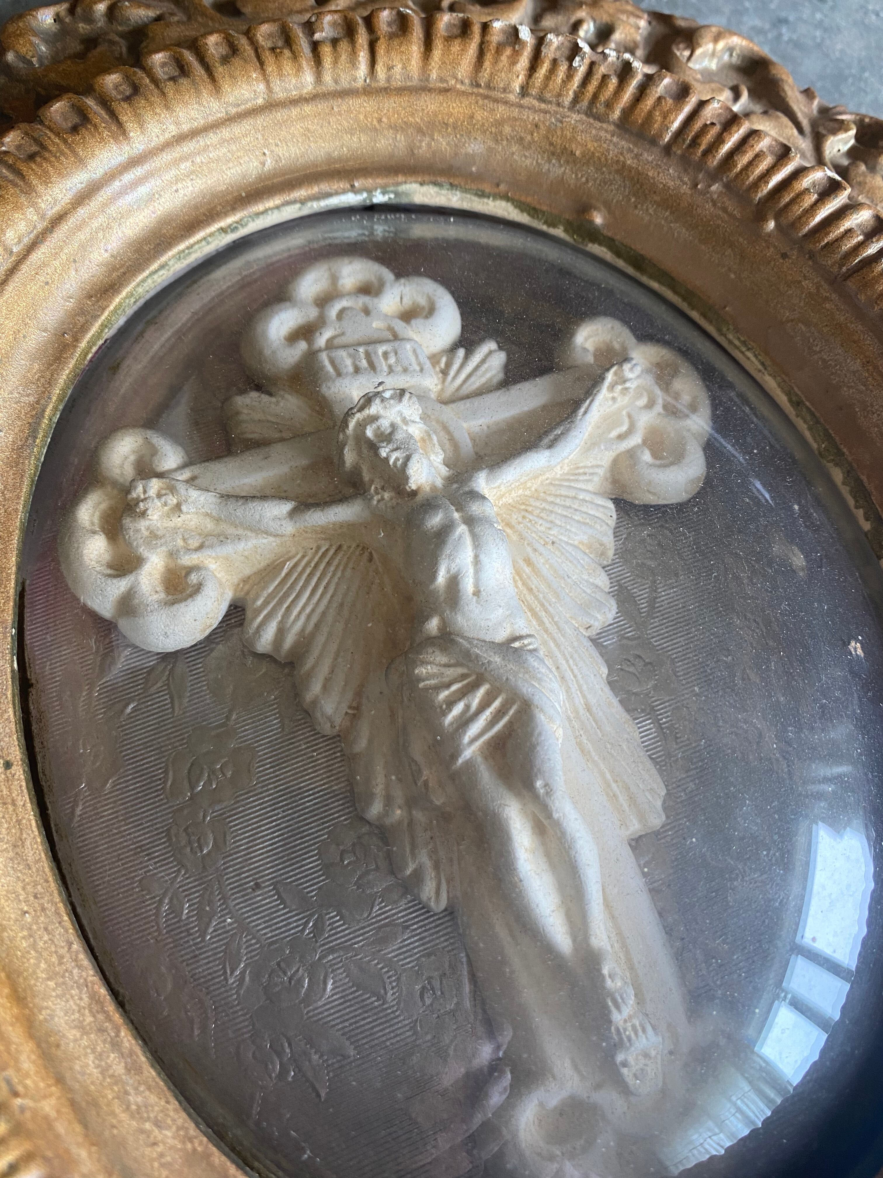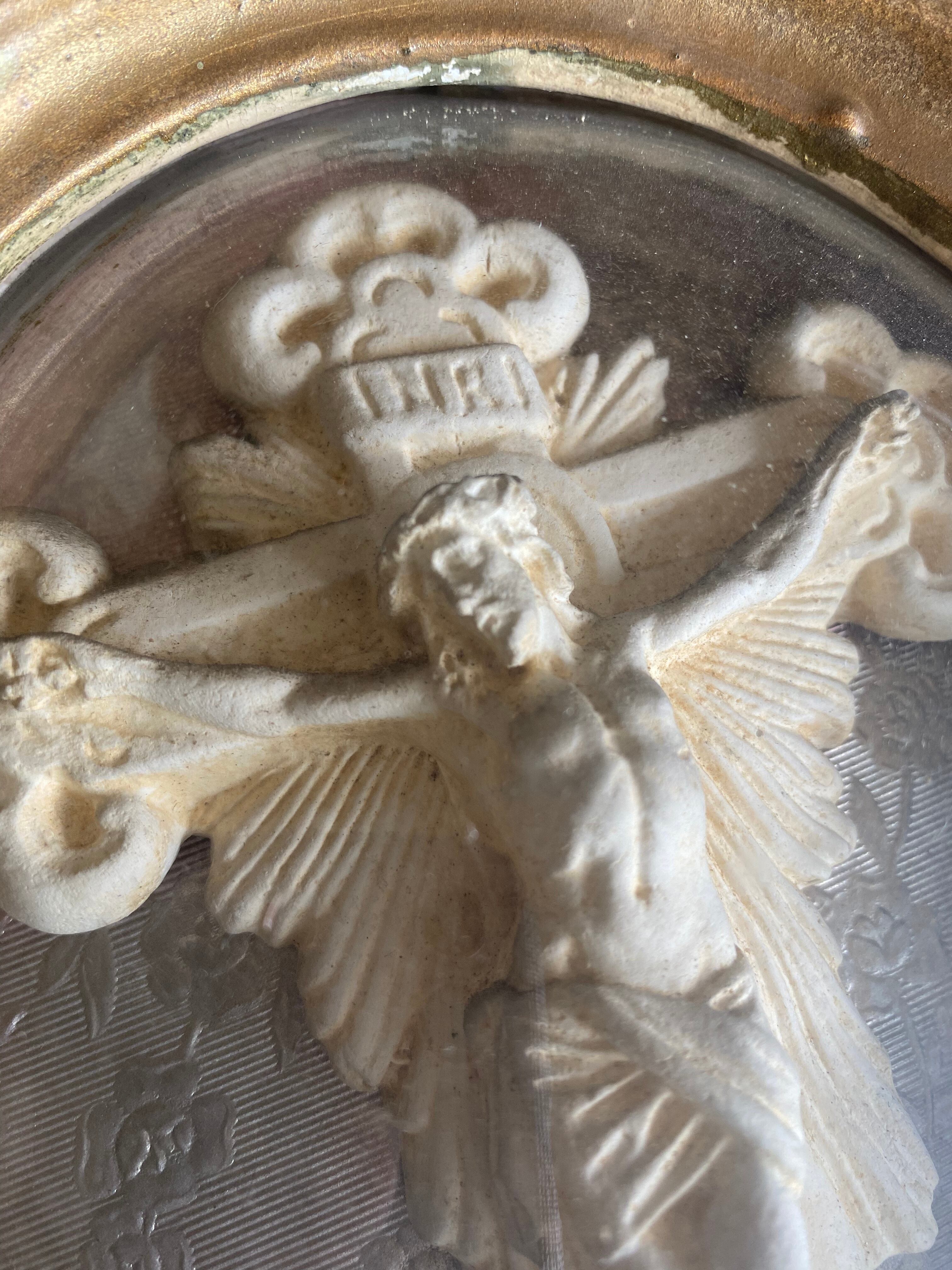 凸ガラスの下の十字架と石膏フレーム。フレームの縁に多少削れとペイントの剥げはありますが、大変重厚な雰囲気のあるアンティークです。