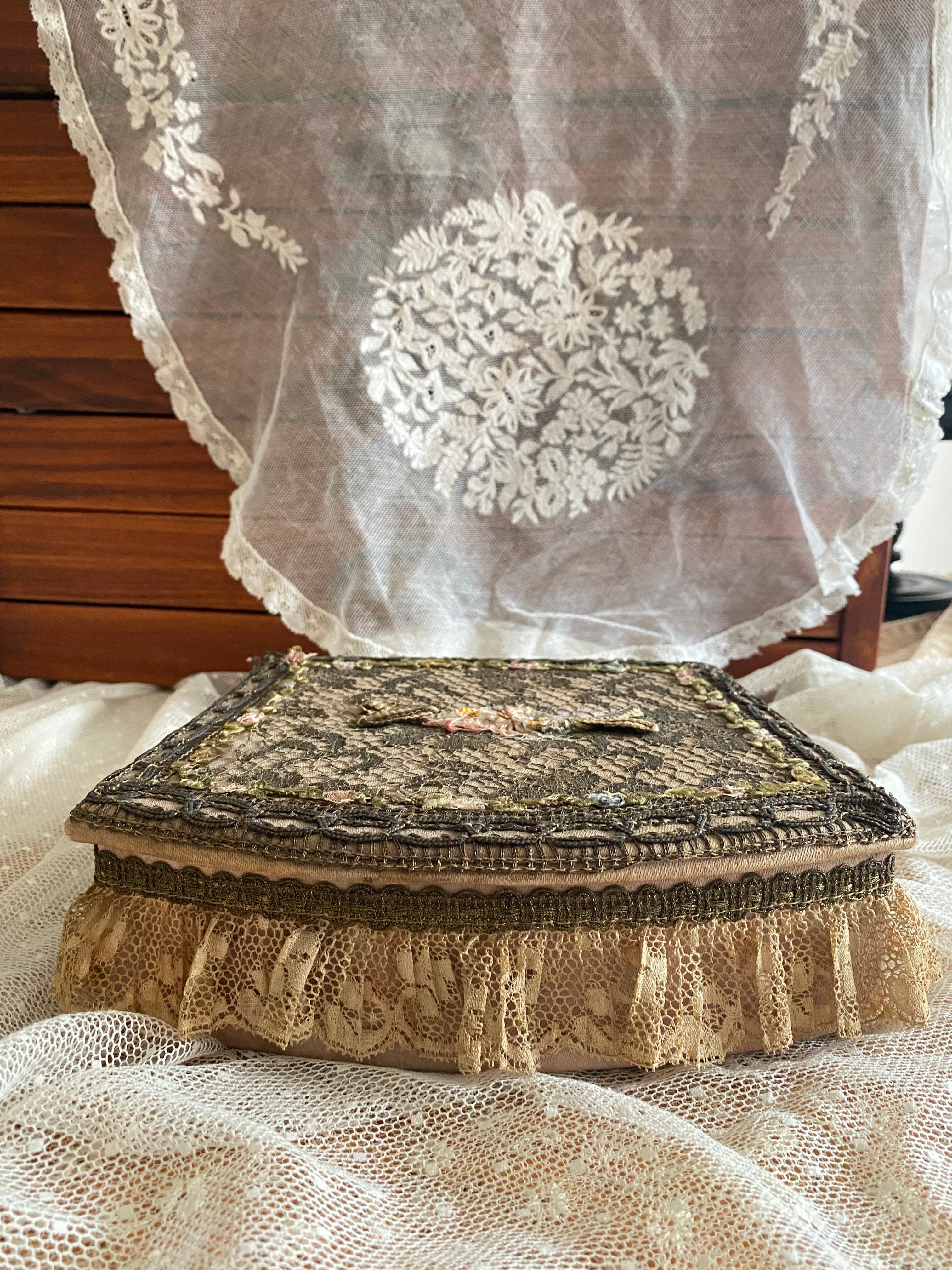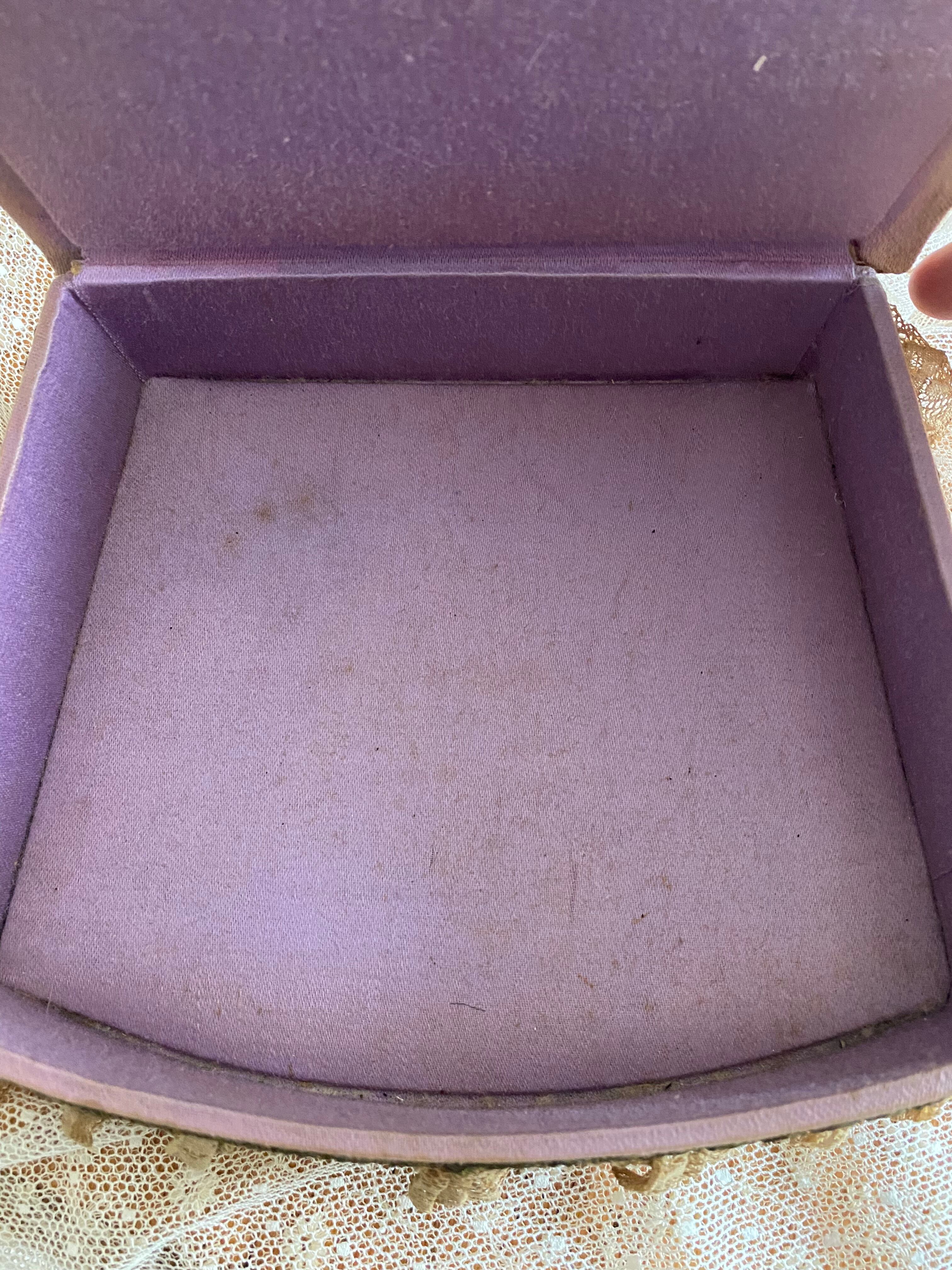 別販売のトレイと同じセットで買い付けたボックスです♪トレイよりはリボンやレースの状態がやや劣化していますが、アンティークの風合いとしてお楽しみくださいませ。内部は貴婦人好みのラベンダーカラーのファブリックが貼られています。多少汚れはありますが、破れなどはございません。ボックス自体のお作りもしっかりしていますのでまだまだこれからも長くご愛用頂きたい素敵な箱です。